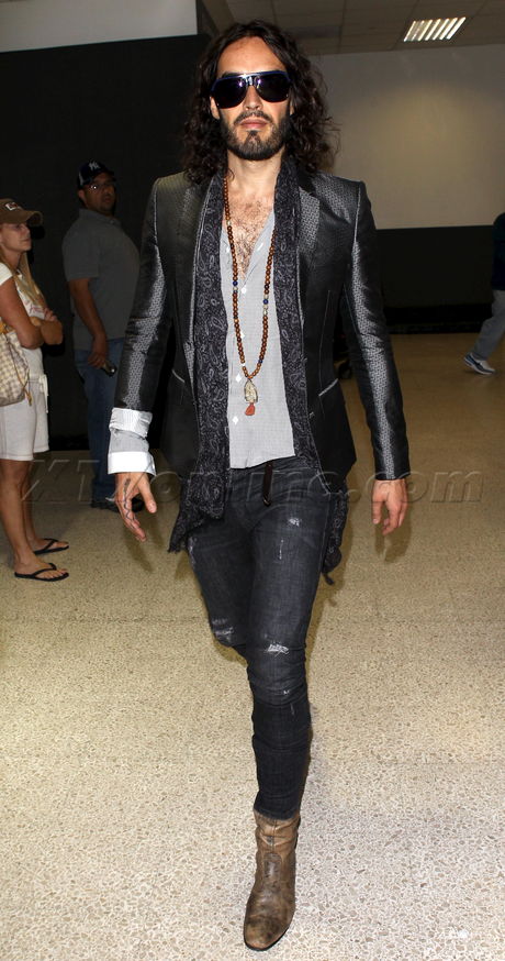 The brash comedian was spotted looking smug and stylish at Los Angeles International Airport on Wednesday. He seemed to be in high spirits despite recently cancelling gigs in the Middle East for his new comedy tour after learning that his safety might be compromised. Russell was dressed in his usual ostentatious fashion in all its scarf, chest hair, and silk blazer glory.