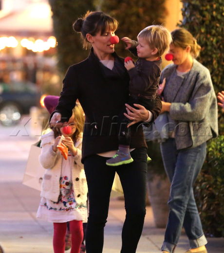 On Saturday Jennifer Garner took her three kids to a holiday party, and later the group tried on clown noses at a store in Brentwood. On the way out little Samuel couldn't resist trying to grab at his mom's face while Seraphina and Violet trailed behind with the nanny.