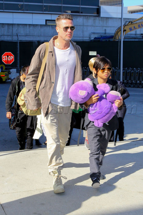 Angelina wore black pants and a bright green wrap while Brad wore light khaki pants, boots and a light brown jacket. Shiloh rocked an AC/DC t-shirt (such a little rebel!) and Pax carried a large purple teddy bear and stuck close to his dad.
