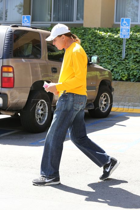 Brucey sported 1990-cut mom jeans with a shirt to match his yellow afternoon treat, and his usual cap and ponytail.