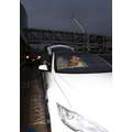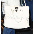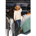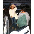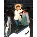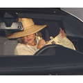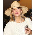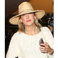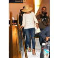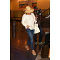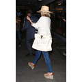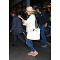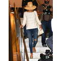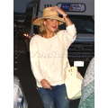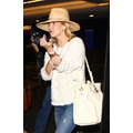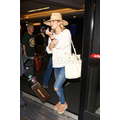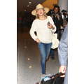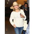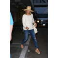 On Tuesday night, the sun-kissed actress jetted into LAX wearing a straw hat, off-white sweater, blue jeans, and corral wedged sandals.