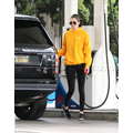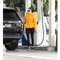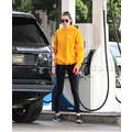 Kendall Jenner gases up her Range Rover while wearing a scowl and a sunny sweatshirt on Friday.