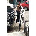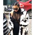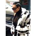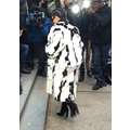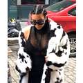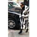 Kim Kardashian flaunts her post-baby cleavage in a deep plunging black top and pants, paired with a black and white fur coat as she draws a crowd wherever she goes running to meetings in NYC.