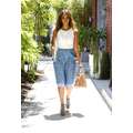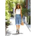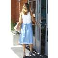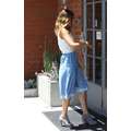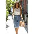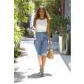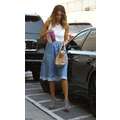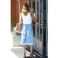 Jessica Alba looking amazing, with her hair down, in a pale blue skirt and sleeveless top.