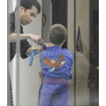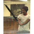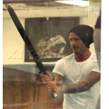 The soccer star was his youngest son's partner for an activity involving swordplay.