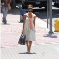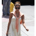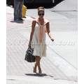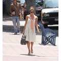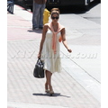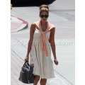 Eva Mendes looks summery and sweet in a cream-colored dress with a peach sweater draped over her shoulders.