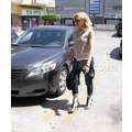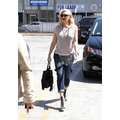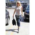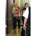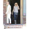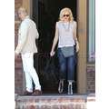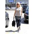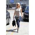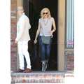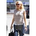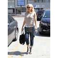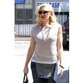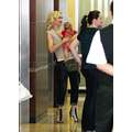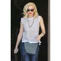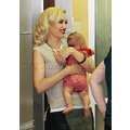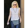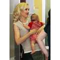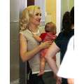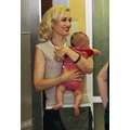Gwen Stefani was smiling while holding son Apollo, in folded overall and a sleeveless top.