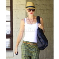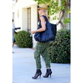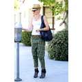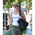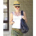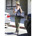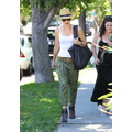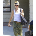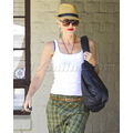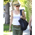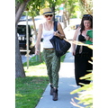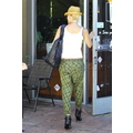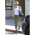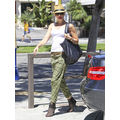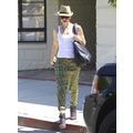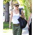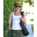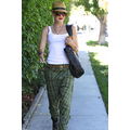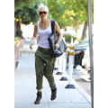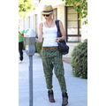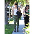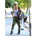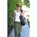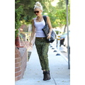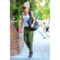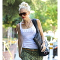 Gwen Stefani wears baggy, green plaid pants with a white tank on a working day in Beverly Hills.