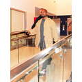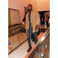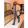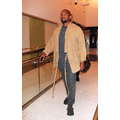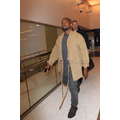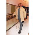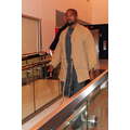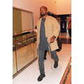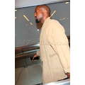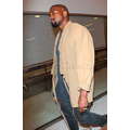 Kanye West dresses up his usual tee shirt and jeans with a khaki-colored kimono, for a flight to Atlanta.