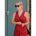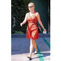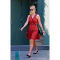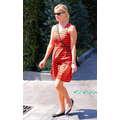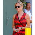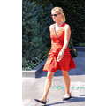 Reese looked casual chic in a bright orange dress with a navy blue pattern.