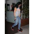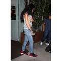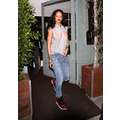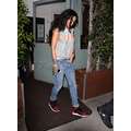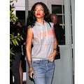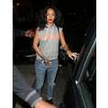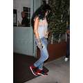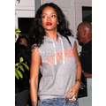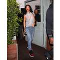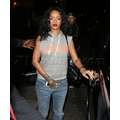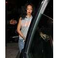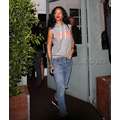 Rihanna looked casual in Nike kicks, boyfriend jeans and a grey sleeveless hoodie with the word "lover" during dinner at Giorgio Baldi.