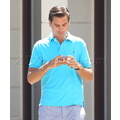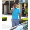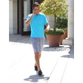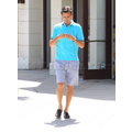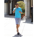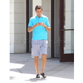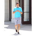 The reality TV star looks preppy in a blue polo while running errands.