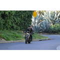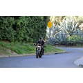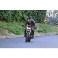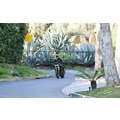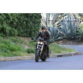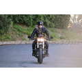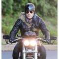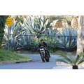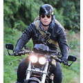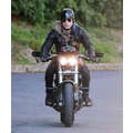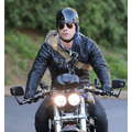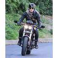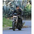 The actor speeds around on his motorcycle.
