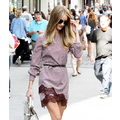 The model cruises around NYC in a fashionable tiny outfit.