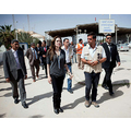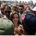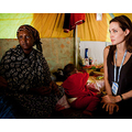 Angelina Jolie, as the Goodwill Ambassador for the UNHCR, visits Libyans in a refugee camp in Tunisia.
