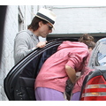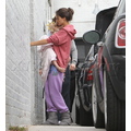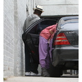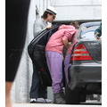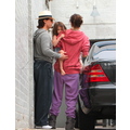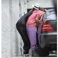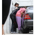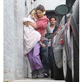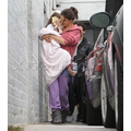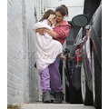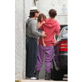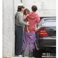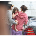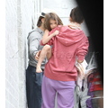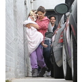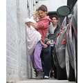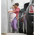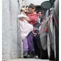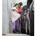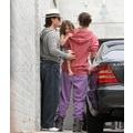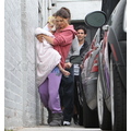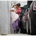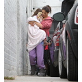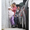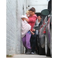 Suri hides from the cameras as her mom and dad carry her into her dance studio.