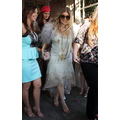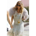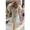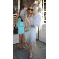 Fergie heads to her baby shower in an eclectic ensemble. She hid her growing baby bump under a gorgeous mint green flapper dress with pink rose detail.