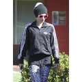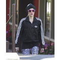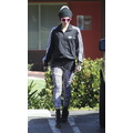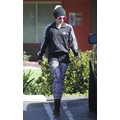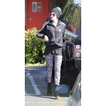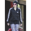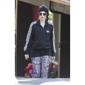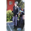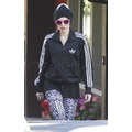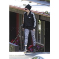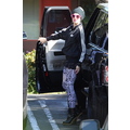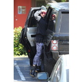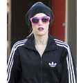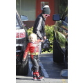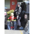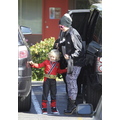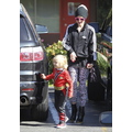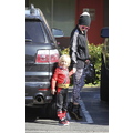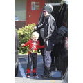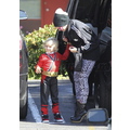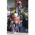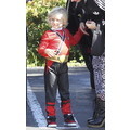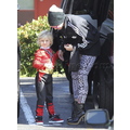 Gwen Stefani in black and white wearing pink shades taking Zuma, who is dressed like a superhero to school.