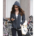 Jessica Biel wears a hoodie and shades while listening to her iPod