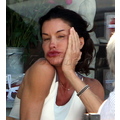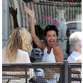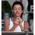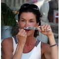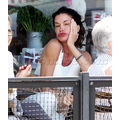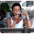 The supermodel checks her teeth while out to eat.