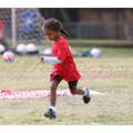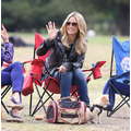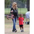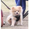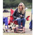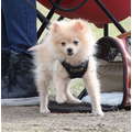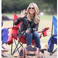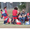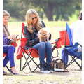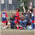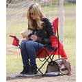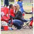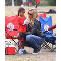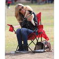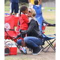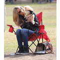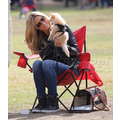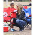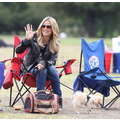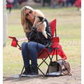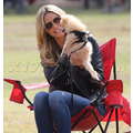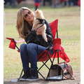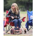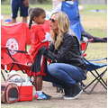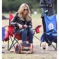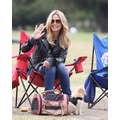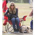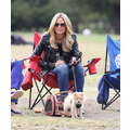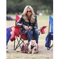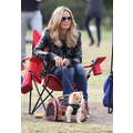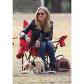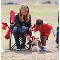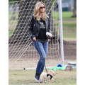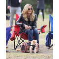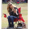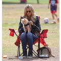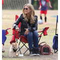 The model brings her dog to the soccer game.