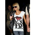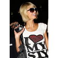 Paris wore a sequined shirt advertising her affection for her style while heading to London with boyfriend Doug!