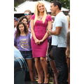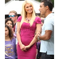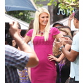 Paris Hilton puts on a sexy pink dress to greet her fans.