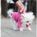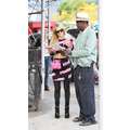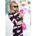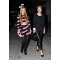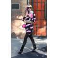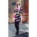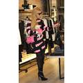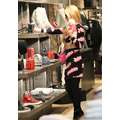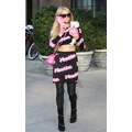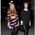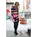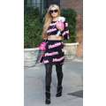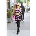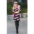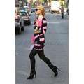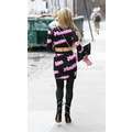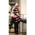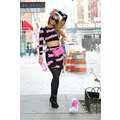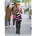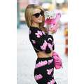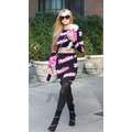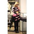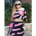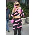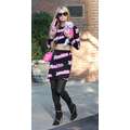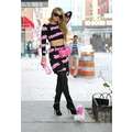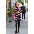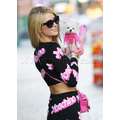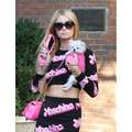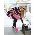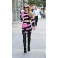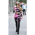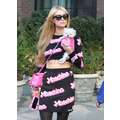 Paris Hilton shopping in NYC with her dog wearing an over the top ridiculous Moschino outfit with boots and tights before going out to dinner with Nicky Hilton
