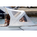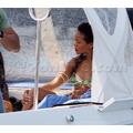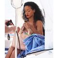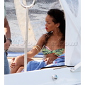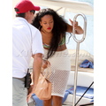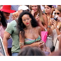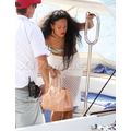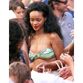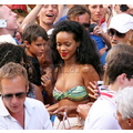 Rihanna shows off her perfect abs in a bandeau top and white skirt.