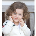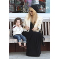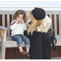The stylist and her son sit on a bench.