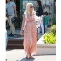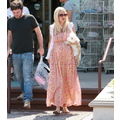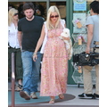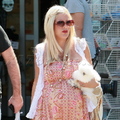 A very pregnant Tori Spelling carries a chicken doll while filming her reality show.