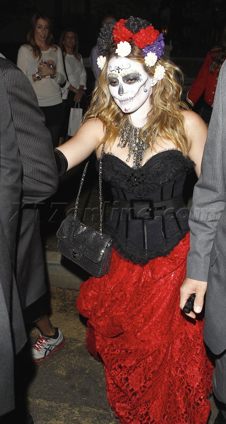 The 25-year-old actress' outfit looked just as amazing, pairing the work of art with a cleaving-bearing black corset and long red skirt. She wasn't the only one with makeup as her hubby Mike Comrie donned some white face paint to go with his skeleton get up. Glad to see them able to enjoy themselves without having to worry about baby Luca!