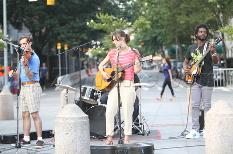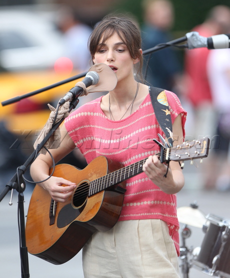 Pirates of the Caribbean star took the stage to shoot a scene that featured her strumming the guitar, and belting out a tune with her band on the NYC set, while her on-screen love interest, costar Adam Levin,